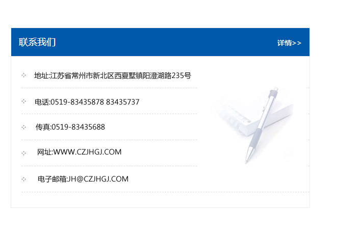 地址:常州市新北區友邦商務大廈1幢16、17層  電話:0519-85101652  傳真:0519-85112595  郵編:213022  網址:www.cz-jiayue_cn.mykaili.com  郵箱:xiajifengaa@163.com
